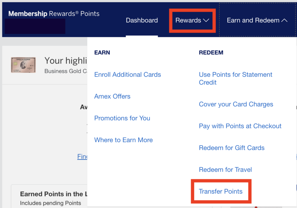 Transferring your Membership Rewards® to partners is pretty simple. First, log on to your Amex account and navigate to your Membership Rewards®. Then, choose Rewards, then Transfer Points.