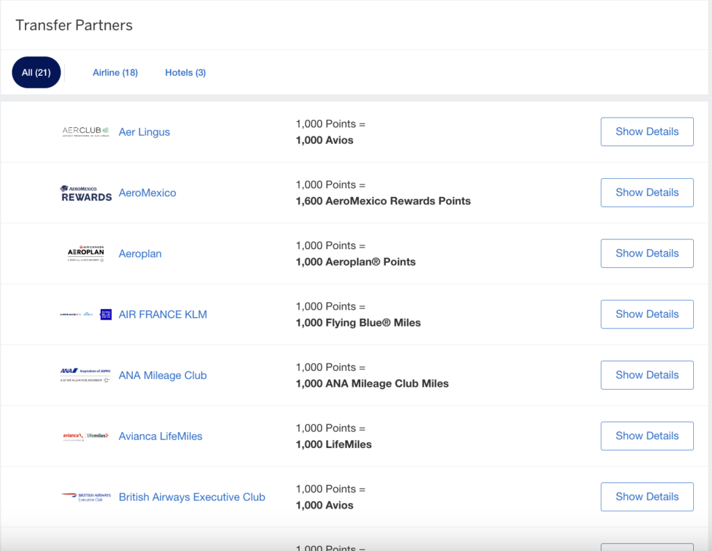 One of the most valuable ways to use Membership Rewards® points is by transferring them to travel partners. Amex has an impressive list of 21 airline and hotel transfer partners. All points generally transfer at a 1:1 ratio, although a few partners have different rates, which are noted below.