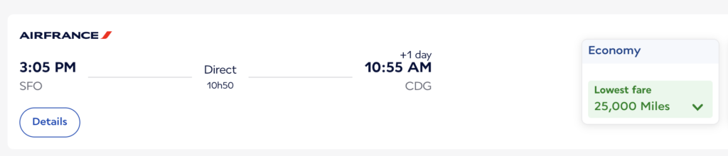 Instead, I can transfer points to Flying Blue (the award program for Air France) and book the exact same flight for 25,000 miles. So I’d be getting more than double the value!