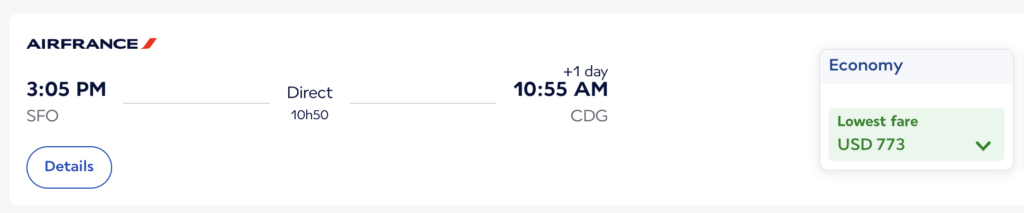 For example, this flight on Air France from San Francisco to Paris costs $773. At a one cent per point value (the lowest basic value of points), this is 77,300 miles.