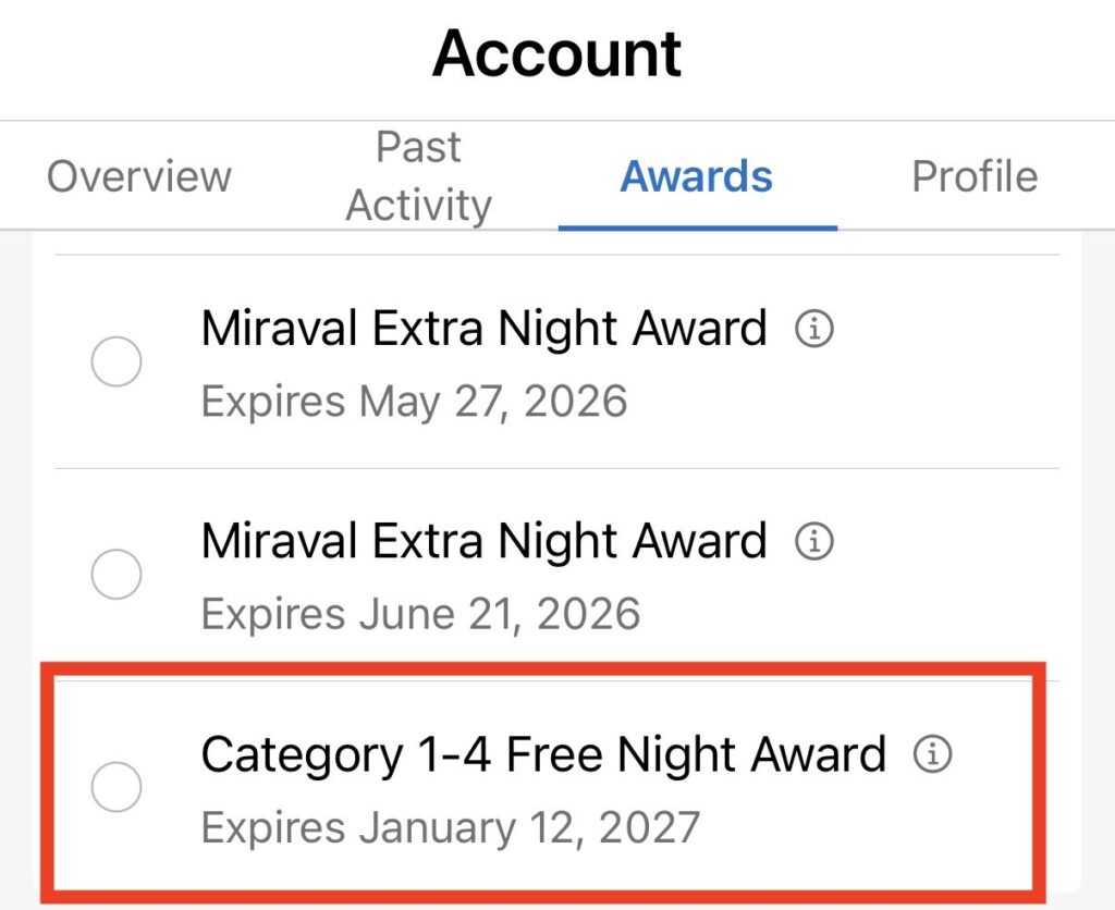 Once earned, Hyatt FNAs live in your Hyatt account under “Awards”. This shows you the awards you have and when they expire.