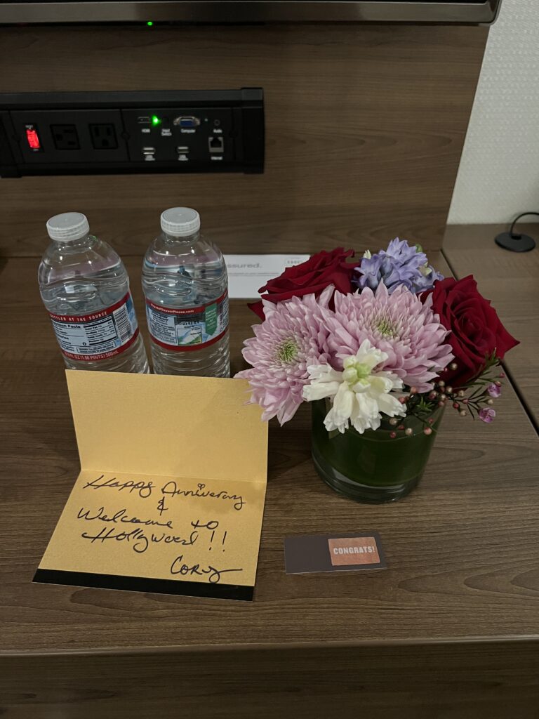 Flowers and a note left for us at the Holiday Inn Express in Hollywood. They also hid candy for the kids in the hotel safe and made them solve a riddle to get the code. So fun!