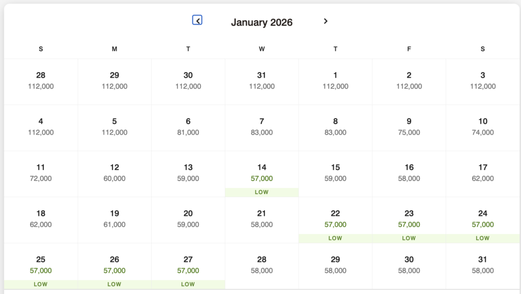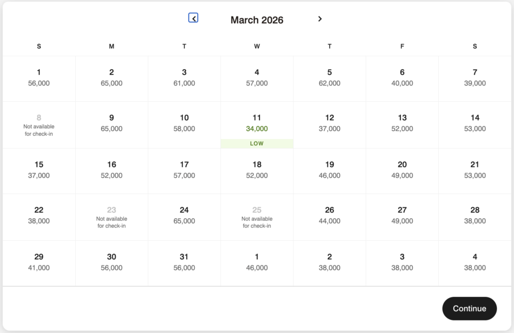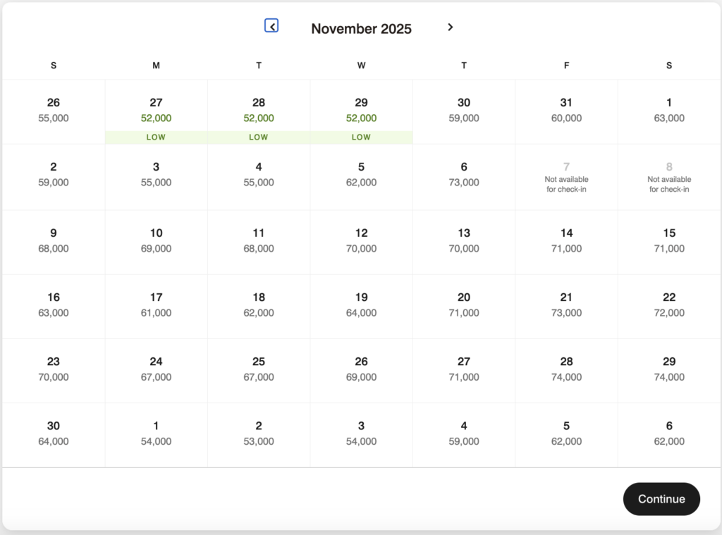 I used the map to narrow down the location, then started checking properties. As you can see, this property is an option, but would require the FNAs to be topped off for all but one night during the month. However, they’re all under 75k, which means we could top them off and not be restricted by nights that are too expensive.