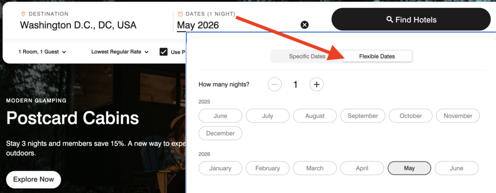 Next, click on the date and select ‘Flexible Dates.’ Then, choose the month you want to travel. This will bring up the award calendars for each property so you can see the lowest dates and/or which properties can be booked with awards.