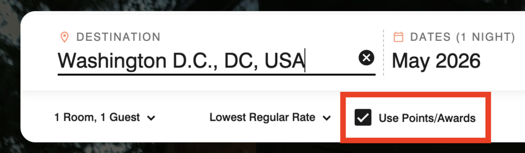 First, go to the Marriott website, type in your city, and choose “Use points/award.”