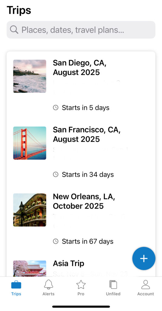You can access your plans offline, share them with others, upload your travel documents, and more. The Pro version is $48.99 per year and lets you get real-time alerts like gate changes or delays, and track your points and miles balances. It’s an excellent tool for staying organized, and a huge lifesaver for me as I plan and book our trips.