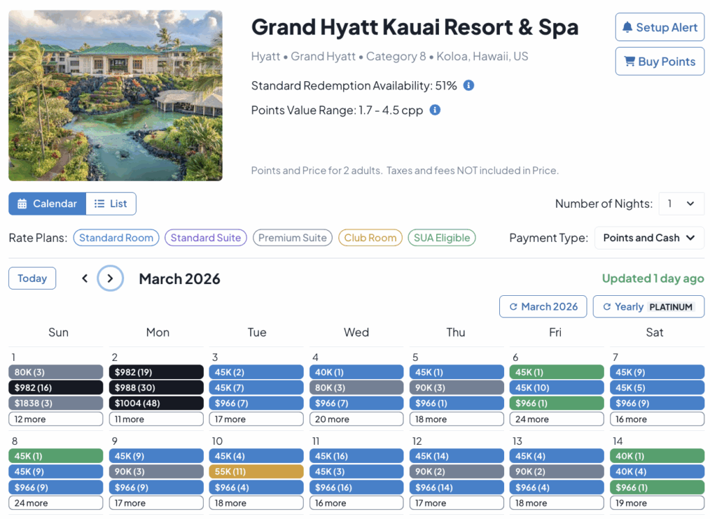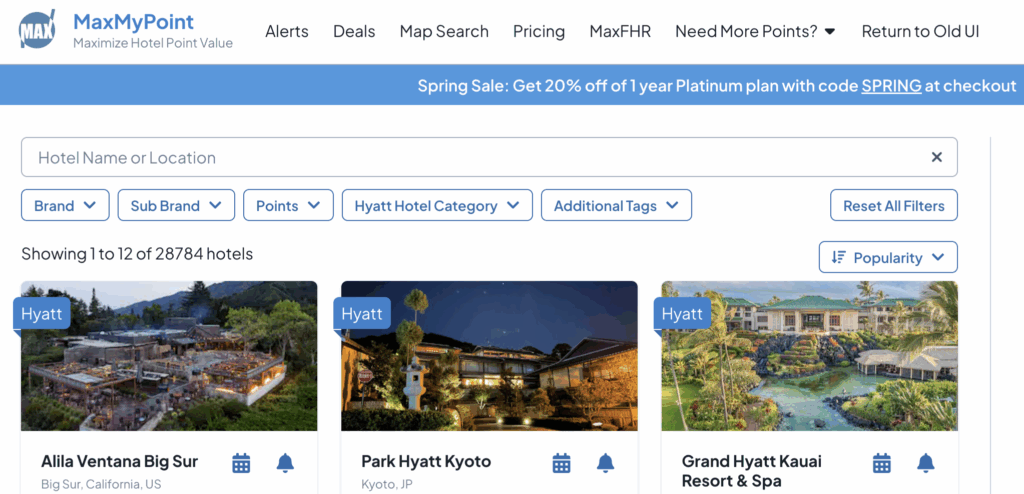 MaxMyPoint is my favorite hotel award search tool. It provides award calendars for hotels, showing all available rates, both cash and points, for any given day. You receive a limited number of free searches per day and can set one free hotel alert at a time. Paid subscriptions start at $3.99 per month and include the ability to set more alerts and browse the website with no ads.