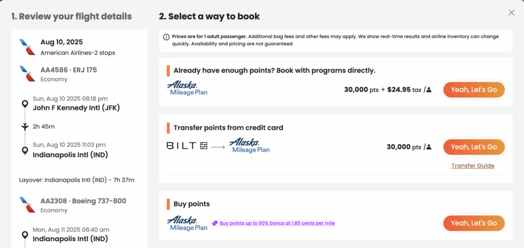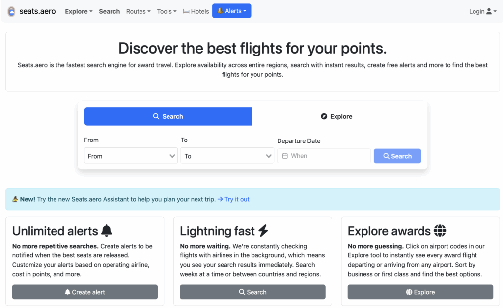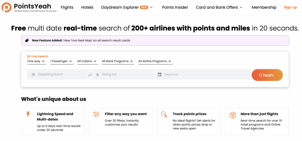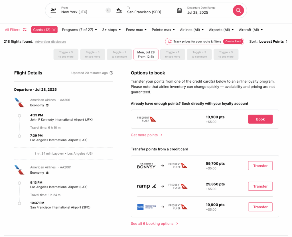 PointsYeah can search both flights and hotels. It’s one of my favorite options for people new to points and miles because it’s user-friendly and has many free search options. Additionally, PointsYeah explains how to book the flight and which points transfer. You can set alerts for when prices drop or when flights or hotels become available. Upgrade for $11.99 per month for features like extra search days and alerts.