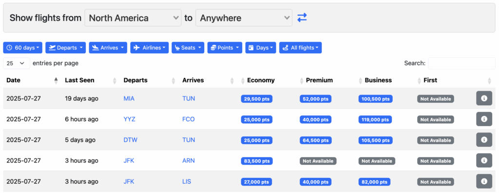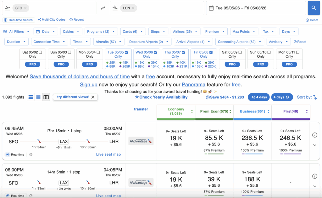 Roame.travel is a user-friendly and informative award search tool. You can use it for free with limited results or upgrade to an annual subscription for expanded search access. I have found that the free version still has a lot of useful features, plus the website is easier to navigate and understand than a few of the other options. Roame also provides step-by-step guidance to help you book the flights you find, which is a very useful feature.