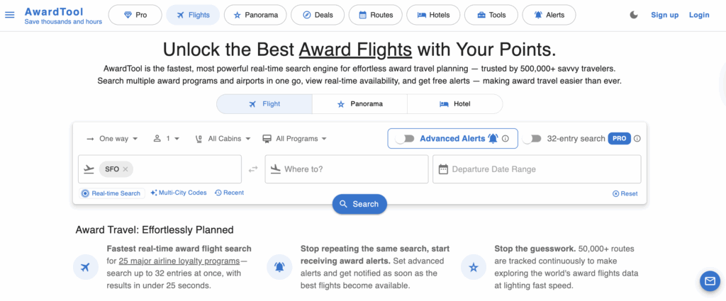 AwardTool is a helpful resource for searching both hotel and airline award availability. You can search across multiple airports and up to four days at once. It shows how many points are required, which programs the points transfer from, and how many award seats are currently available. You can also set up to four free alerts. The free version is great, or you can upgrade to Pro for $9.99 per month for access to more search options and alerts.