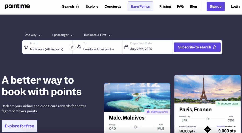 Point.me is another award search tool that lets you explore available routes between any origin and destination. The free plan is the most limited of all the search tool options. Paid subscriptions start at $12 per month and open up many more search options. If you have a credit card that earns American Express Membership Rewards® or Bilt Rewards, you can get a complimentary subscription with unlimited searches for Amex or Bilt transfer partners.