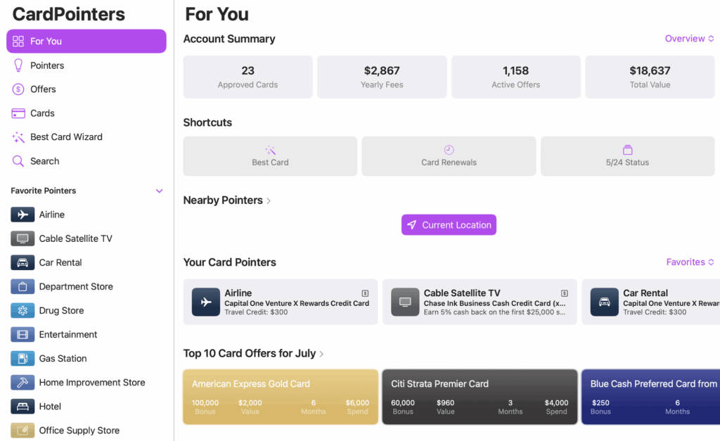 CardPointers is a phone and computer app that helps you maximize your points and cashback by showing you which card to use for each purchase. It tracks your cards’ bonus categories, welcome offers, and bank offers, like Amex or Chase Offers, and can even send reminders based on your location or spending habits.