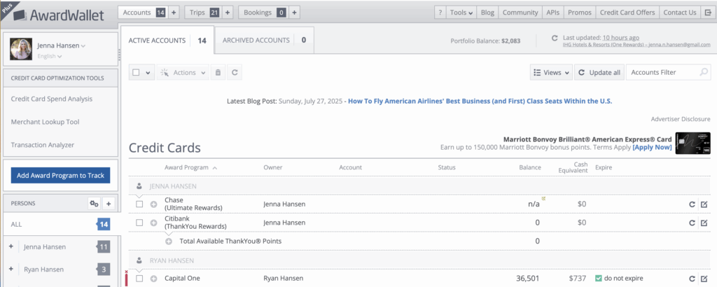 AwardWallet is a free tool that helps you keep track of all your travel and credit card rewards in one place. It monitors your points and miles balances, alerts you when they’re about to expire, helps you track things like free night certificates, and organizes your upcoming trips. You can upgrade to a paid version for extra features like faster updates and more detailed tracking.