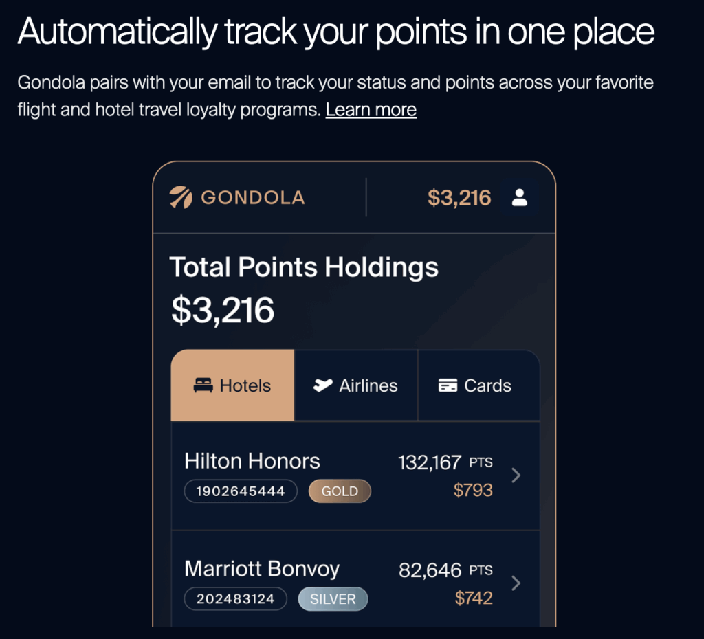 One tool I’ve been really impressed with lately is Gondola, an AI-powered platform that helps you get more out of your points and cash bookings. It pulls all of your hotel, airline, and credit card balances into one easy dashboard, tracks points values and expirations, and even monitors your upcoming hotel reservations for price drops so you don’t miss out on savings. Gondola also compares cash and points rates side by side and recommends hotels based on your travel style. Since bookings are made directly with the hotel, you’ll still earn loyalty perks, hotel points, and credit card points, plus you’ll get an extra 3% Gondola cash back toward future stays.