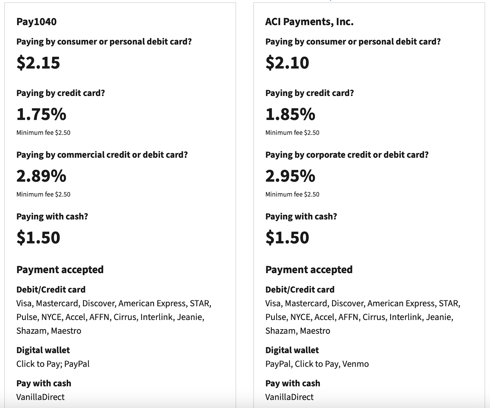 Let’s say you owe a tax bill of $6,000, and you opt to pay with a credit card through Pay1040. The fee is 1.75% with a personal credit card or 2.89% with a business credit card, which means you will be paying $105 or $173 for the processing fee.