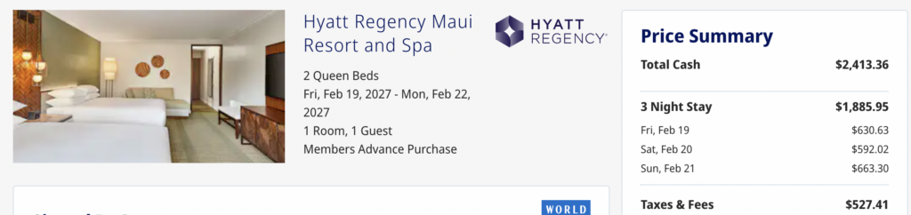 Well, you could book three nights at the Hyatt Regency Maui for 25,000 points per night. The cash rate for those same three nights would be $2,413.