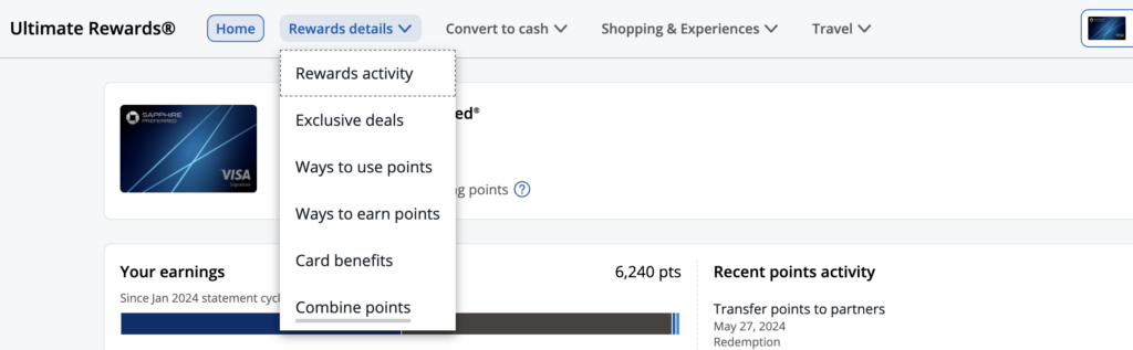 First, log on to your Chase account and click the card with your points, then click on your Ultimate Rewards balance.