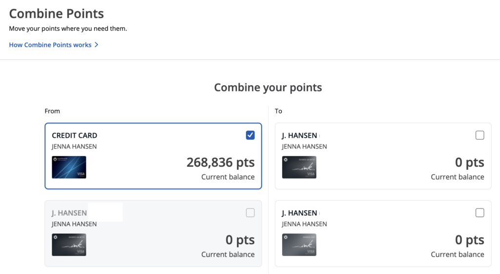 After that, you’ll see all of your cards listed. You can choose which card to move from and which card to move to. I recently moved all of my points from my Ink cards to my Sapphire Preferred, which is why my example only shows points on my Preferred.